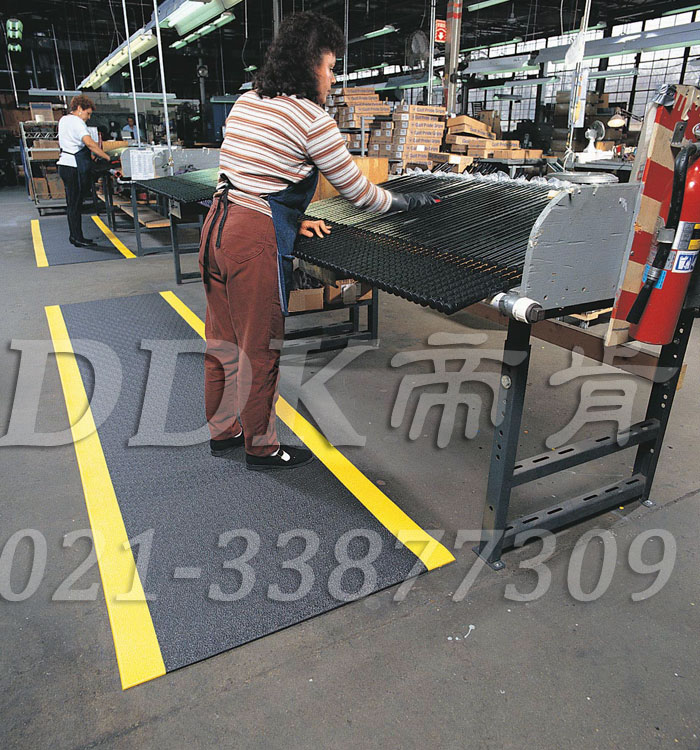 型號:帝肯(DDK)_F120(Dmd|戴門德)彈性壓力緩適車間防滑地毯—是工廠流水線地面防滑旁舒適型走道防滑地毯,非常適于工廠地面、實驗室地面和車間通道地面等地方。提供3mm/5mm/9mm/12mm厚的獨特菱形柳葉紋表面(標準型)可選定制。顏色:黑色帶有黃色條紋的安全帶,或有全黑色。減低環境噪音。美化地面。
