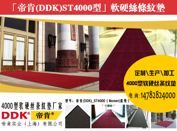 | 外門前除塵用軟硬絲條紋墊地毯型號「帝肯DDKST4000」,平行軟硬絲凹凸條紋構造,合適的間距能有效的刮除鞋底的沙塵并且能隱藏在凹槽底部、即實用又美觀。將這種地毯型除塵地墊鋪設在進門入口以及行人通道可以刮除行人鞋底的泥沙和吸收鞋底水分,間接的保持地面衛生干凈,刮沙吸水綜合性能佳,清潔也十分的方便。適用于各種商業環境及高人流量區域,如酒店,商場,寫字樓, 機場,公寓等各類出入口。也可以當迎賓地毯 |